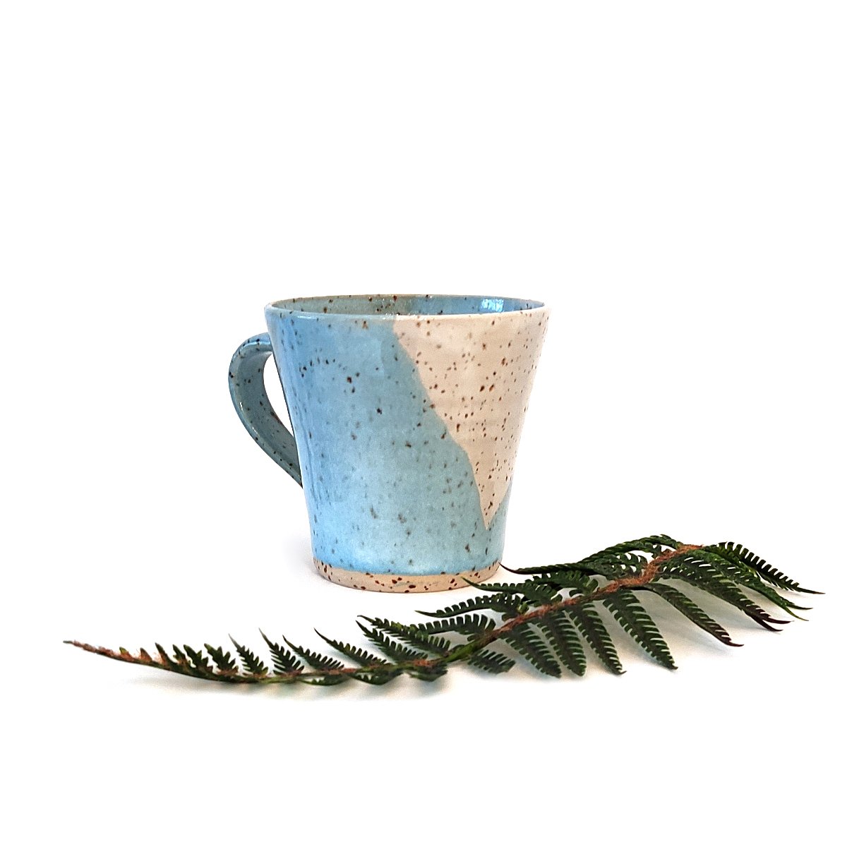 A lovely blue and white speckled ceramic mug by local potter Harriet Bright.