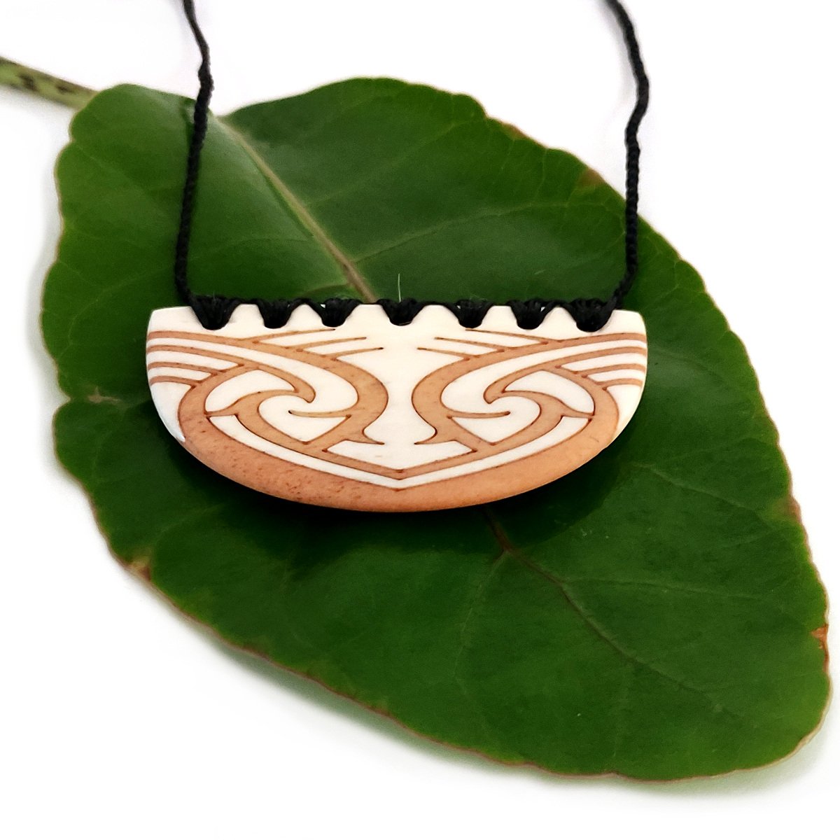 This stunning bone breast plate pendant, carved by artist Amanda Thompson (Ngā puhi), embodies the concept of 'Unity'. The intricate design is first laser-cut onto the bone, then skillfully enhanced using a traditional tea-staining method to darken the engraved areas. It is completed with an adjustable, plaited wax cord woven securely through the top.