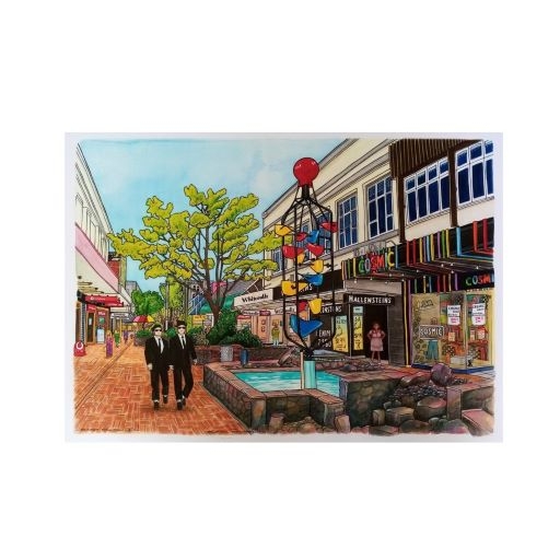 Bucket Fountain is a detailed colourful artwork showcasing the iconic Bucket Fountain which is located in ‘Cuba Square’ central Wellington, NZ. Originally named the ‘water mobile’, the fun kinetic sculpture was created by Burren and Keen, and Graham Allardice and is now recognised as one of Wellington’s most famous landmarks.
