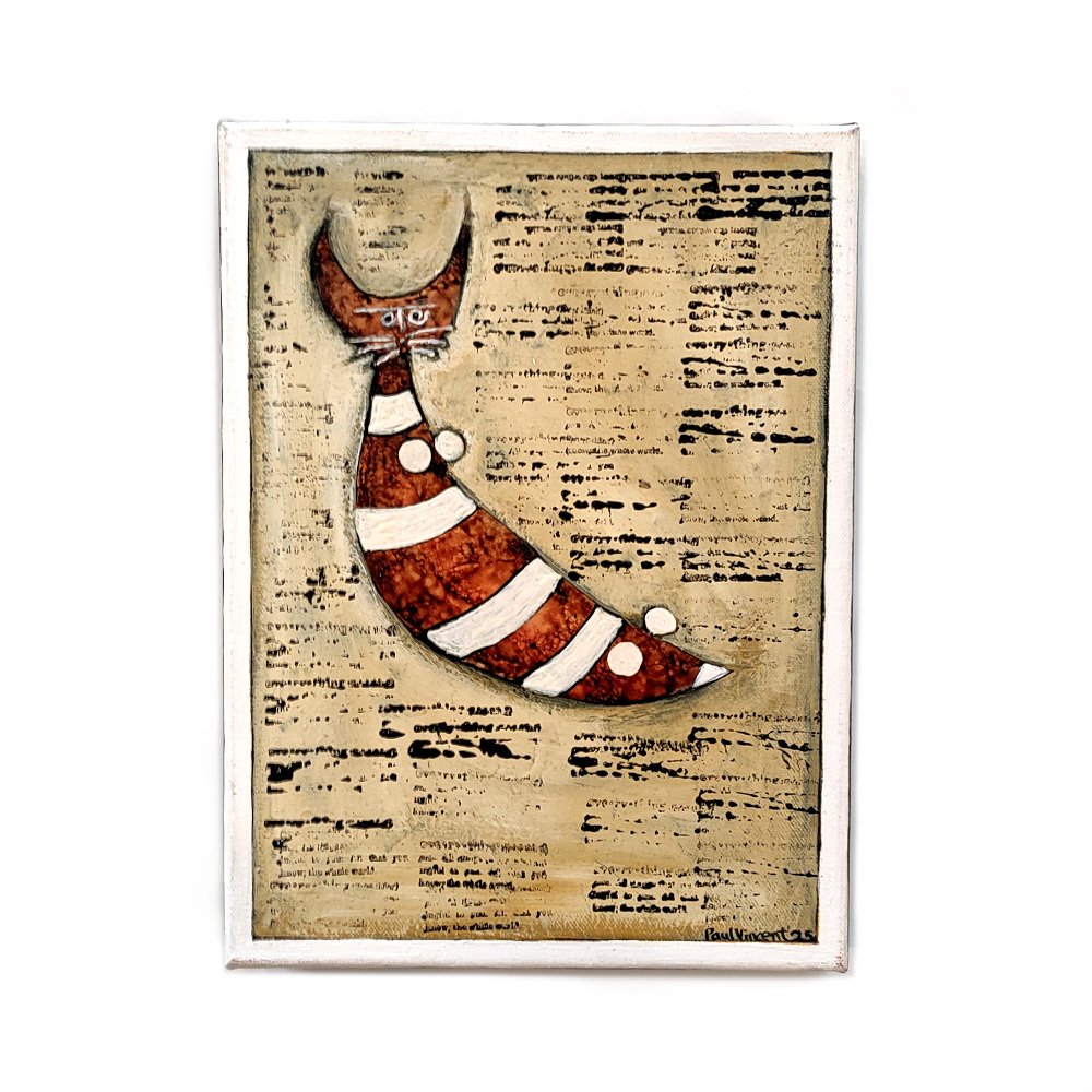 Original mixed media floating Cat painting on canvas by Paul Vincent. Wellington based artist Paul Vincent brings a distinctive quirky style and sly humour to his work, offering viewers a fresh and engaging perspective that often holds a delightful surprise. This reflects his ongoing quest to make life more interesting, inviting audiences to see the world with a touch more wonder.