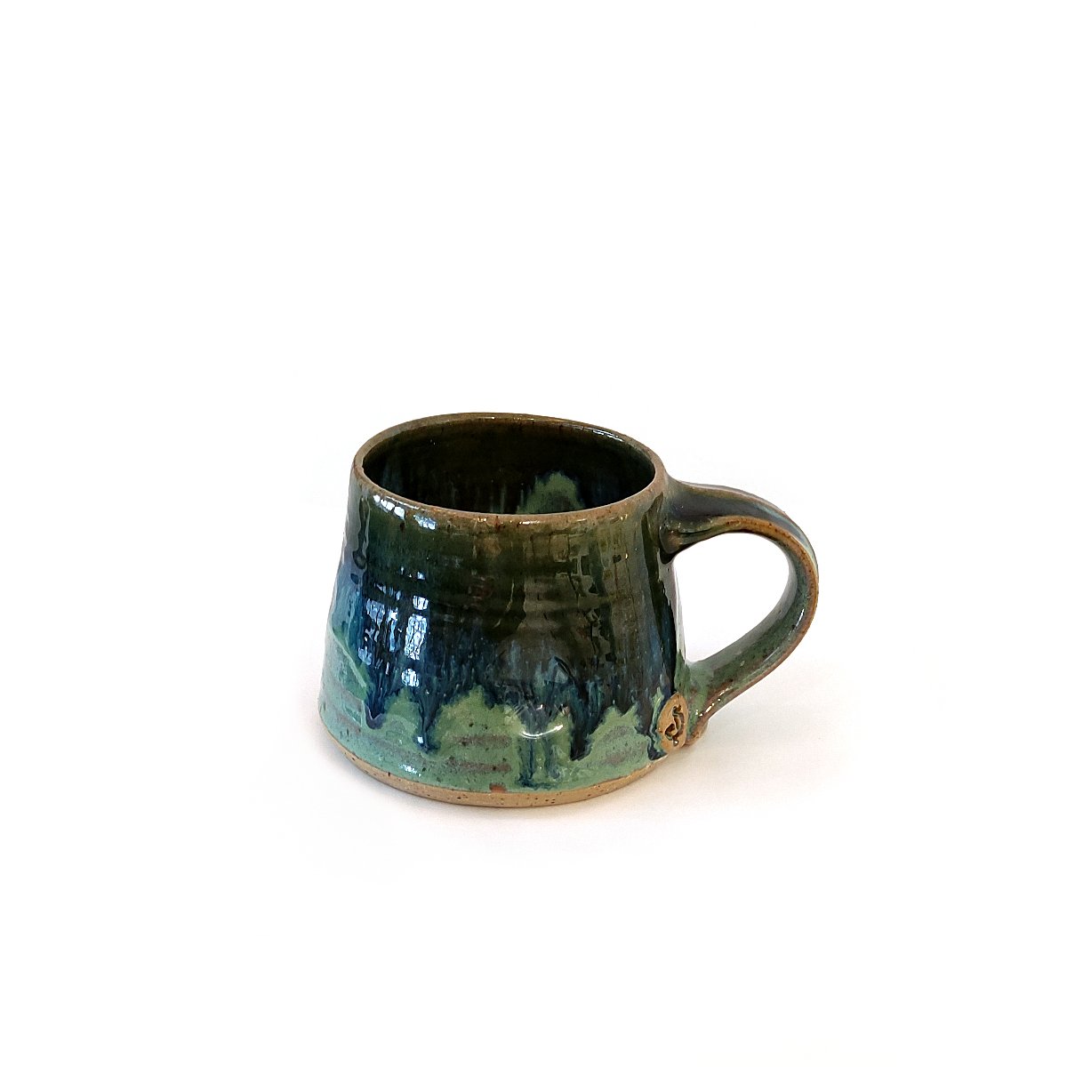 Elevate your morning ritual with this striking conical shaped ceramic mug by Sarah Bromley. Featuring a green glaze that flows in elegant, organic drips.