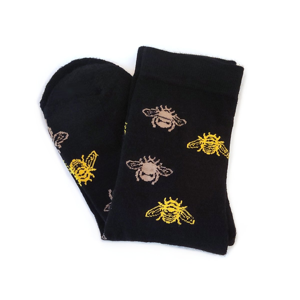 They feature a bumble bee pattern in gold and beige. The socks are a lightweight fine sock, with Terry weave interior padding on the bottom of the foot.
