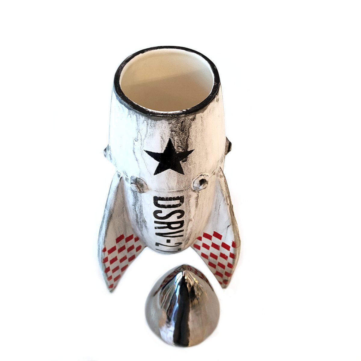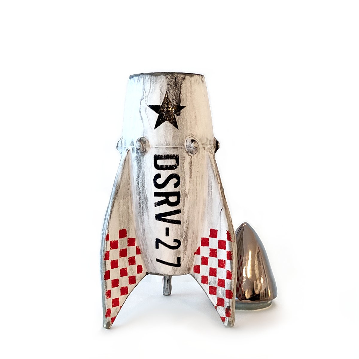 Standing 320 mm tall, this imposing vessel commands attention. While its clear glazed interior makes it a perfectly functional vase, the exterior tells a much more rugged story. Finished with a weathered patina, it bears the hallmarks of a craft that has journeyed through the deep cosmos and braved the intense, scouring heat of atmospheric re-entry.