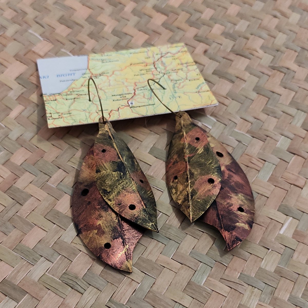 These double pohutukawa leaf earrings are lovingly hand-made from upcycled bicycle tyre inner tubes. The discarded inner tube is thoroughly cleaned and polished, then carefully coloured before the hoops are attached. This meticulous process results in these beautiful, unique earrings, a truly one-of-a-kind jewellery contributing to a better world.