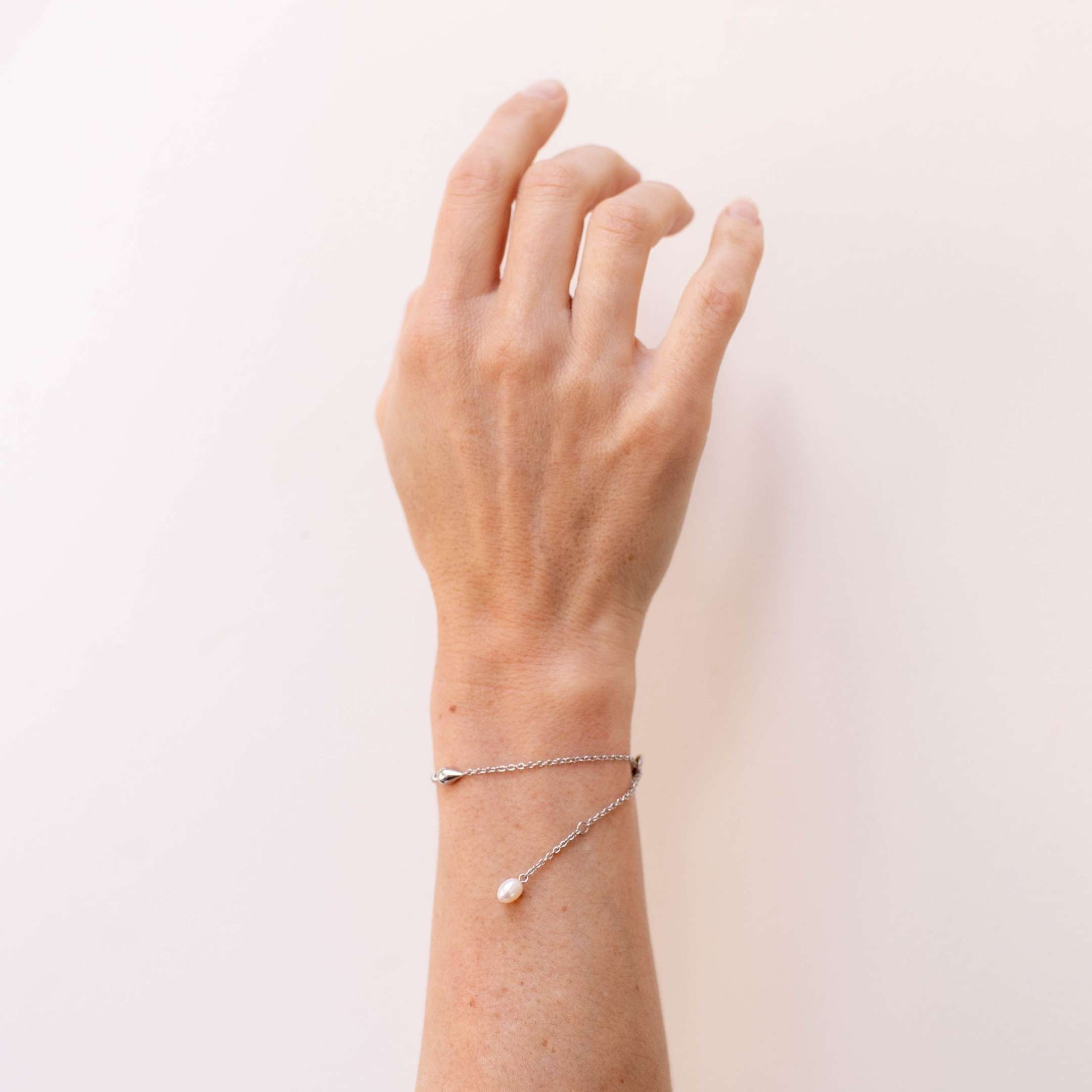 Romantic and timeless, the Drop In The Ocean Moon Glow Bracelet is a stunning sterling silver piece with a classic pearl and a droplet in motion.