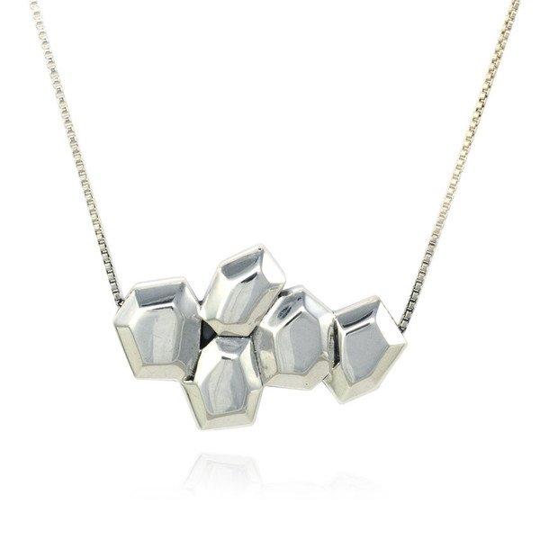A fabulous fusion of modern and retro design from Auckland designer/jeweller Jessica Aggrey. The faceted pendant pieces shimmer beautifully. Made from sterling silver on a silver chain.