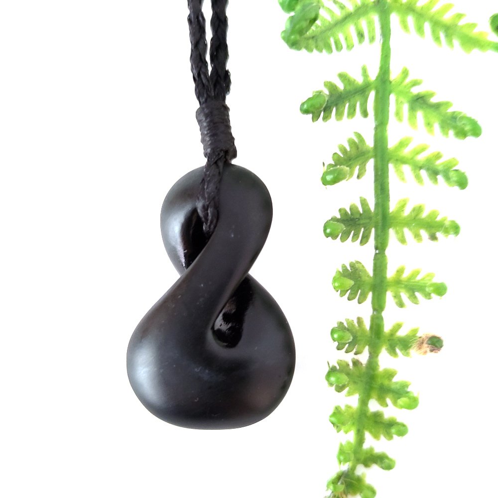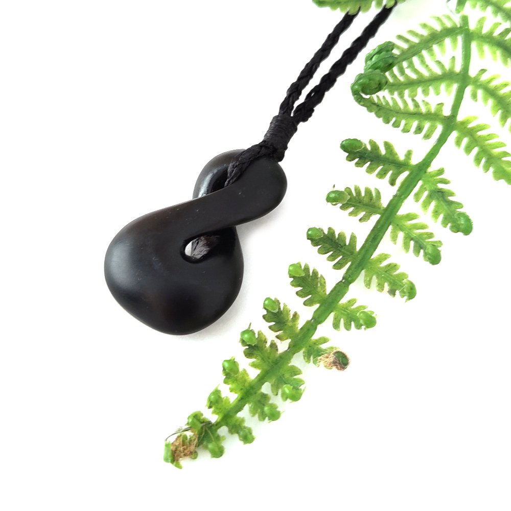 A beautiful hand carved pikorua pounamu (New Zealand greenstone) pendant by Ernesto Ovalle, lashed with black waxed cord with a sliding knot.