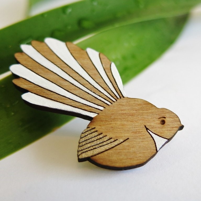 The design of this brooch is based on the Piwakawaka (NZ native fantail). It is made from rimu and is hand painted in white and a little metallic. They have been sealed with beeswax to protect.