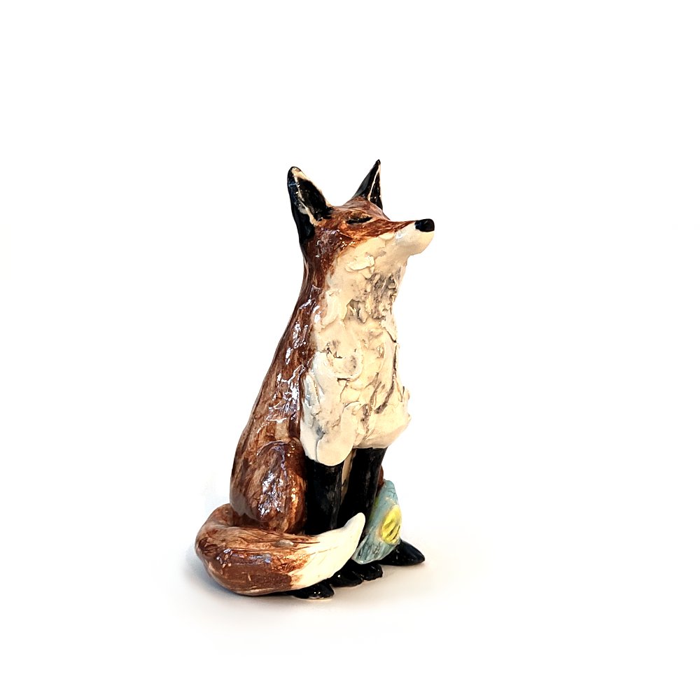 In this stunning, hand-sculpted piece, local artist Cate Pates captures a mesmerizing contrast: the earthy patience of the fox against the brilliant colour of a bluebird. It’s a beautifully crafted study of two worlds intersecting, highlighting the fox’s keen form and the bird’s vibrant color. A unique and memorable work of art to brighten any space.