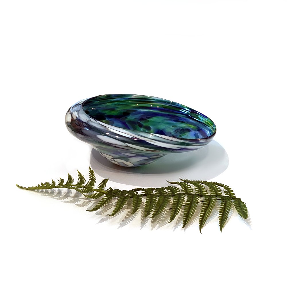 This beautiful hand blown glass paua shell bowl has been created by New Zealand glass artist Anthony Genet from Flamedaisy. Each piece is unique and the colour, patterns, shape and sizes may vary slightly.