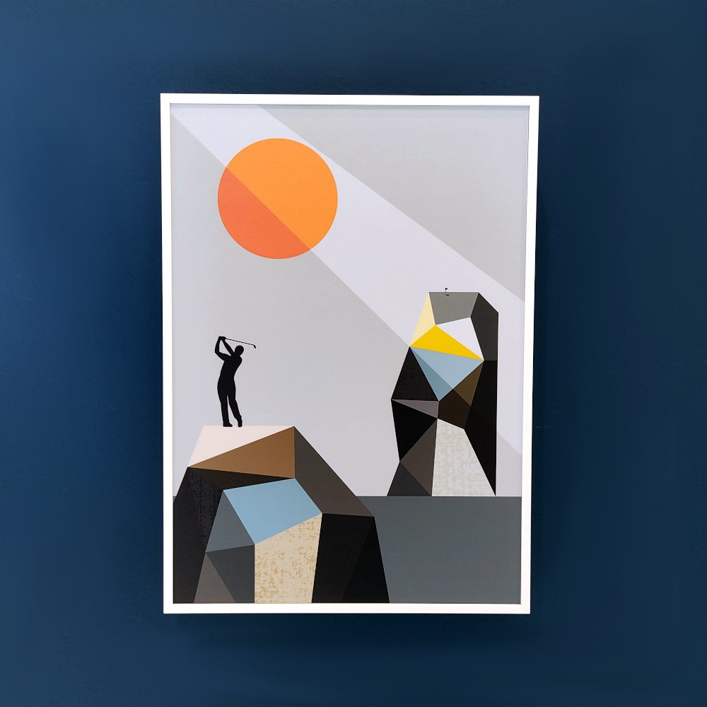 This colourful "Golfer" box frame print is by artist Ellen Giggenbach.