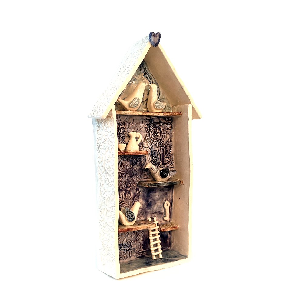 Hand-sculpted by local artist Cate Pates, this whimsical hanging birdhouse captures the delightful scene of birds making themselves at home. More than just decor, this unique piece features meticulous detail and playful character that sparks joy. Elevate your home with this charming piece of local craftsmanship.