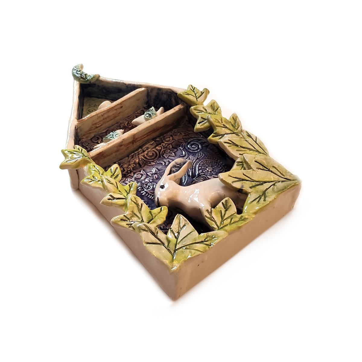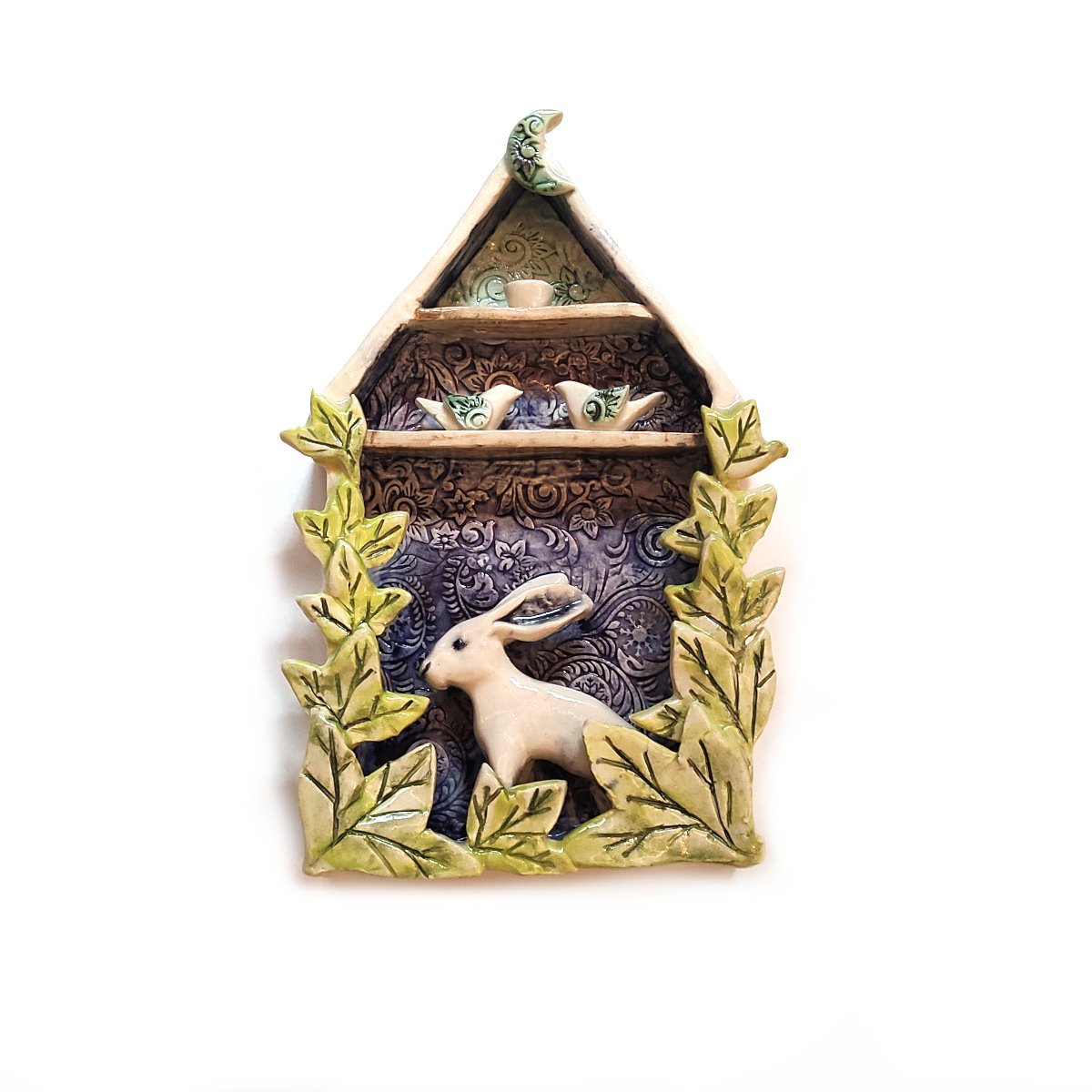 Hand-sculpted by local artist Cate Pates, this whimsical hanging birdhouse with hare captures the delightful scene of the hare making themselves at home. More than just decor, this unique piece features meticulous detail and playful character that sparks joy. Elevate your home with this charming piece of local craftsmanship.
