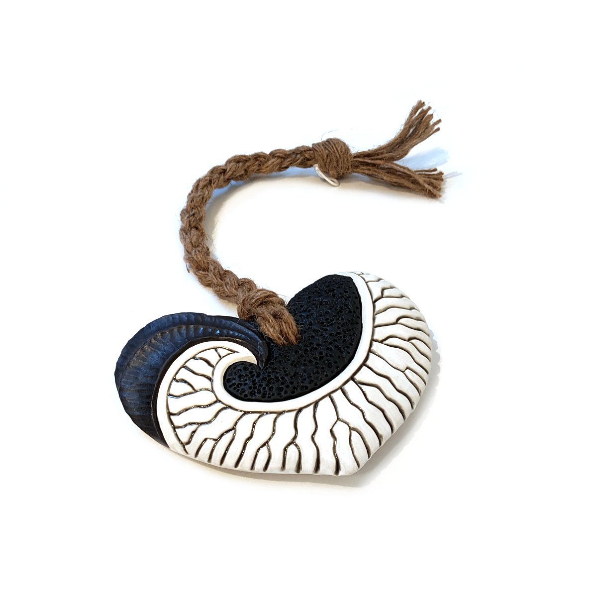An Organic sculptural wall hanging beautifully crafted by New Zealand artist Jo Richards. It’s made from ceramic and has a lovely highly textured crackle surface. A discreet loop is secured at the top of the knotted four plait rope to enable the sculpture to be easily hung on a small picture hook or pin nail. It looks great on a long narrow wall or hang it in groups of 3 or more. Each piece is handcrafted and unique.