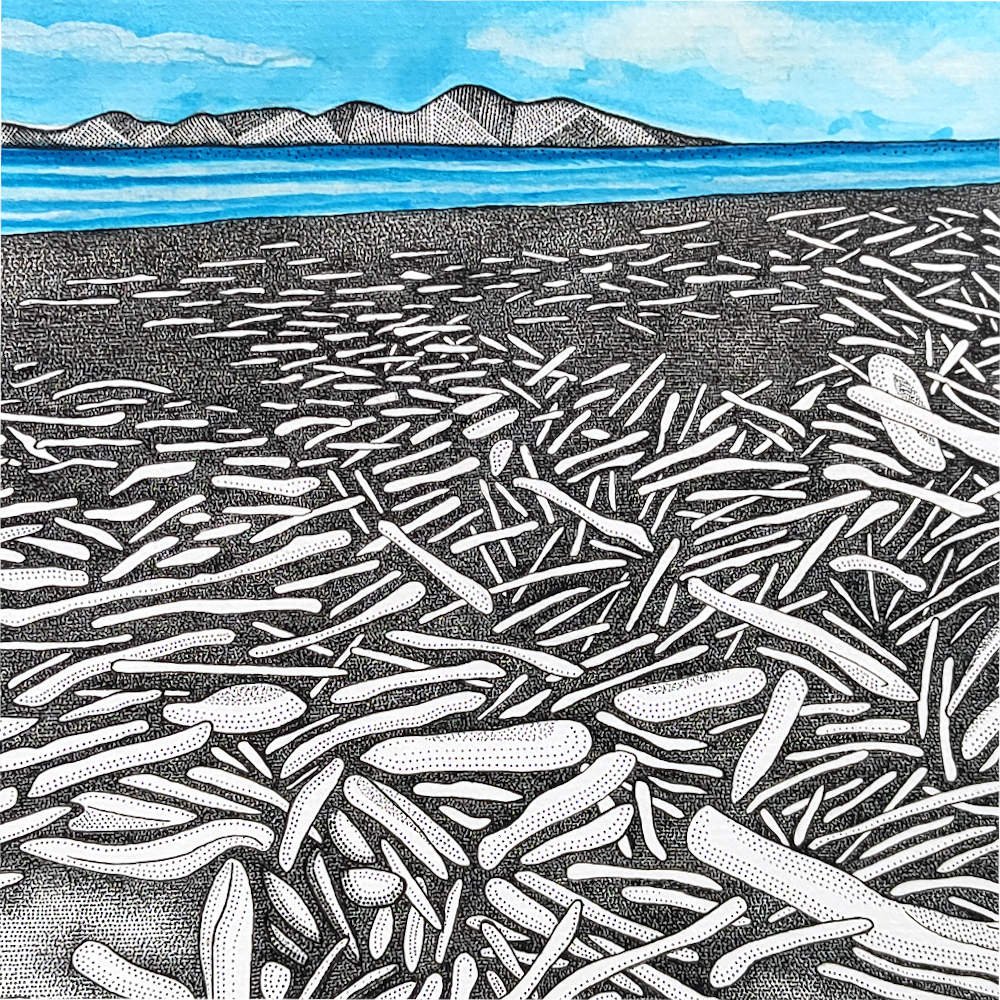 This limited edition fine art print is based on an original artwork by Penelope Reid. It depicts driftwood on Paekākāriki Beach, with Kāpiti Island featured in the background.