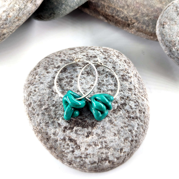 A unique pair of glass knot earrings on sterling silver hoops. The twists and turns of the class make a fun squiggly knot and no two pairs ever come out the same. These earrings are individually hand crafted in Isla Osborne’s garden studio using a blowtorch to shape the glass before cooling it slowly in a kiln for durability.