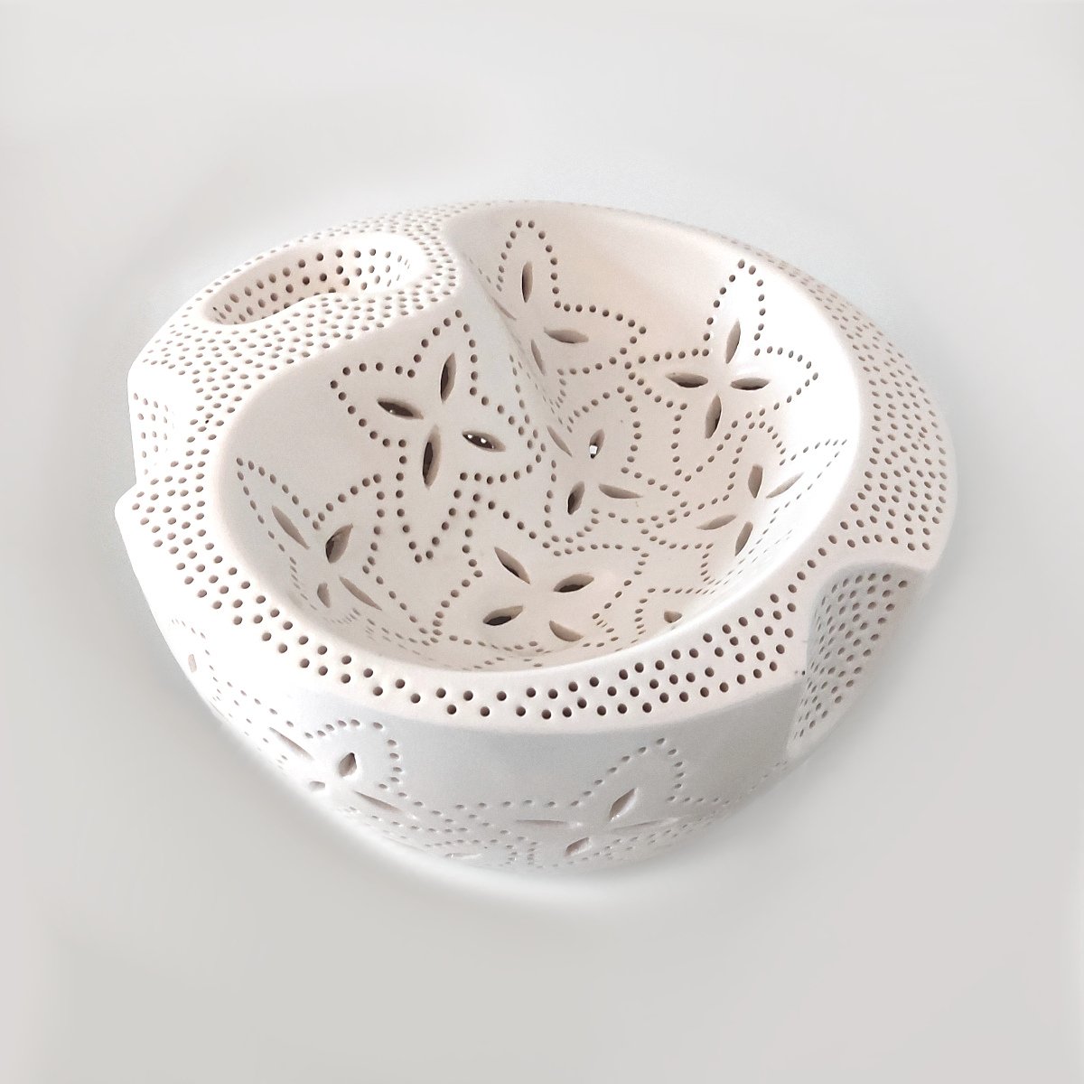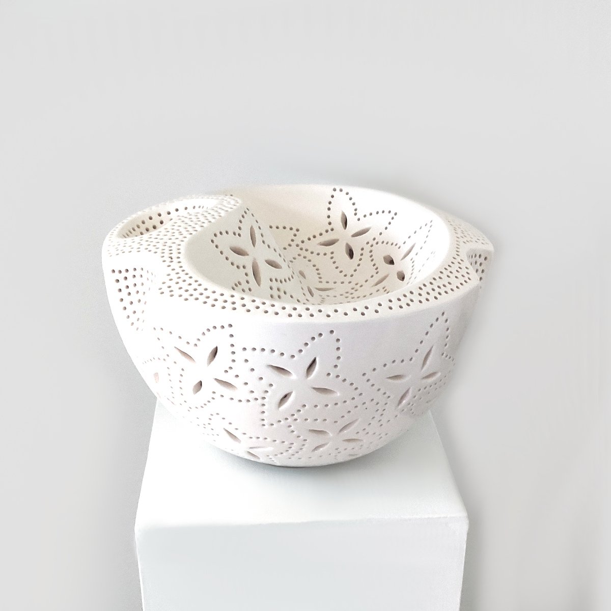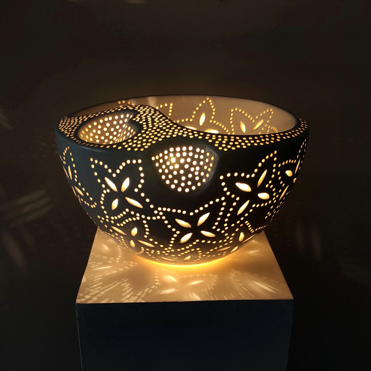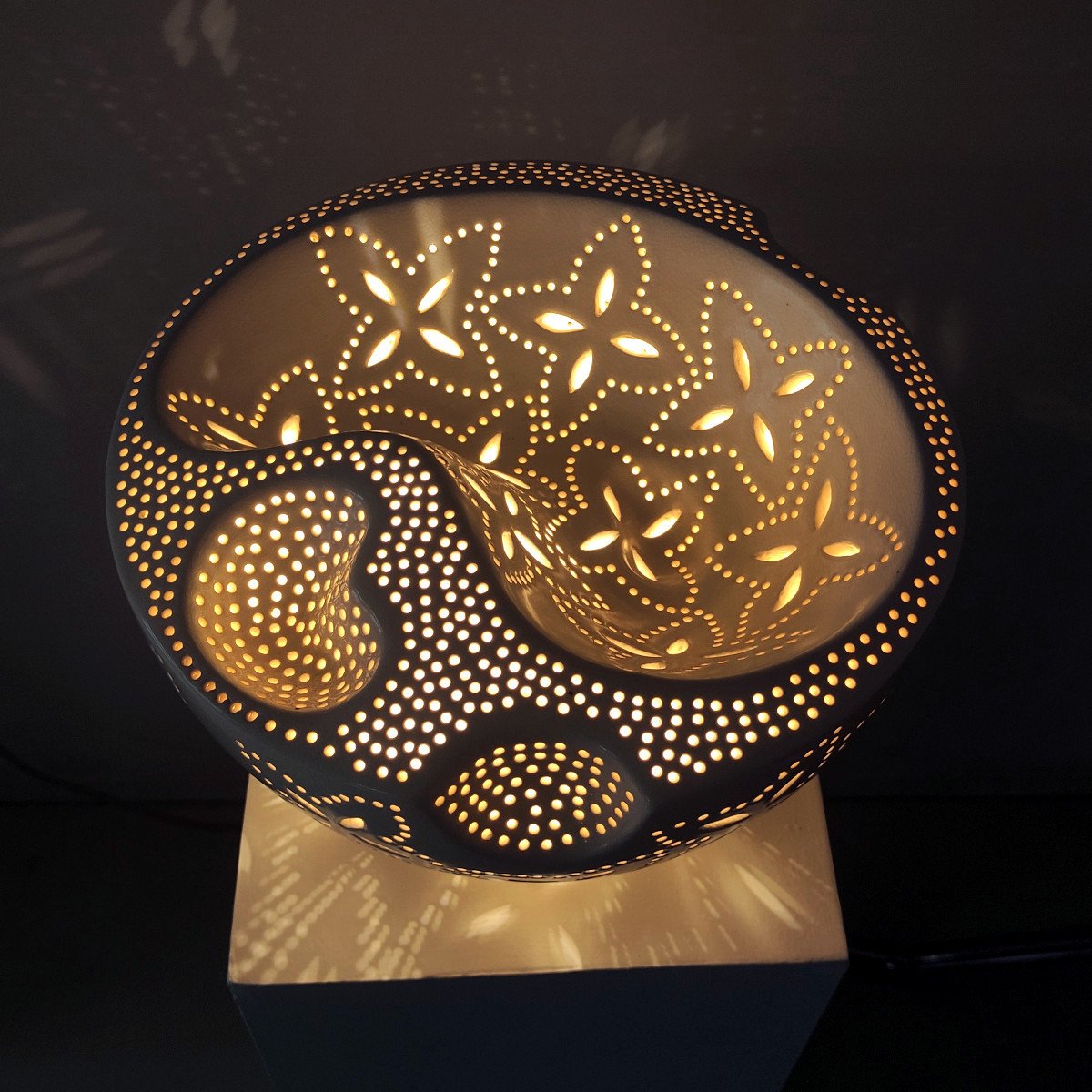 Handcrafted in New Zealand by artist Ronald Andressend, this ceramic lamp is a true statement piece. Its distinctive pattern is achieved through the meticulous process of hand-carving into the raw clay, followed by applying a white glaze and then firing. The result is a beautiful light source that delivers outstanding warmth and atmosphere, creating dynamic, ambient patterns of light and shadow throughout the room.