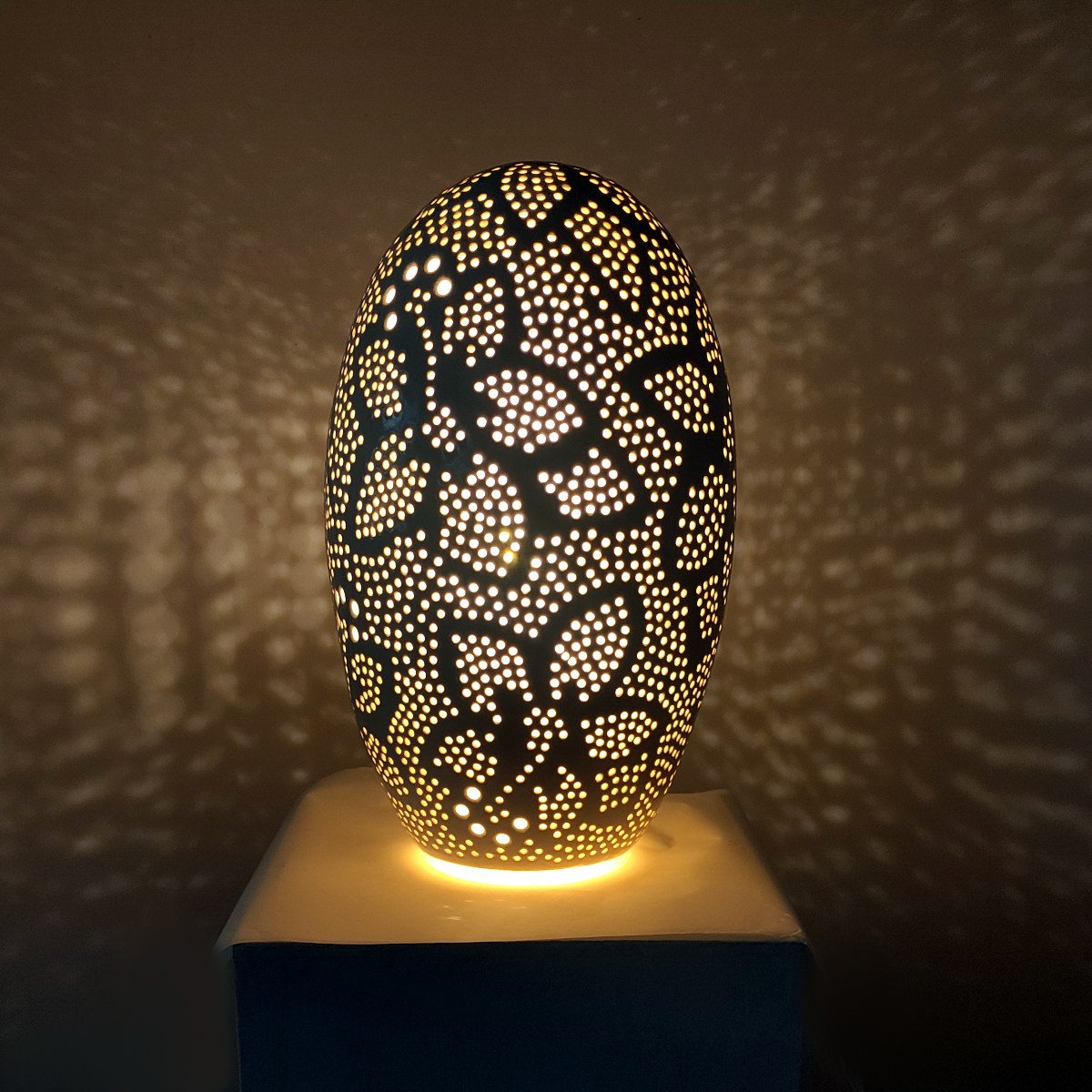 Handcrafted in New Zealand by artist Ronald Andressend, this ceramic lamp is a true statement piece. Its Le Aute pattern (which refers to the Hibiscus flower) is achieved through the meticulous process of hand-carving into the raw clay, followed by applying a white glaze and then firing. The result is a beautiful light source that delivers outstanding warmth and atmosphere, creating dynamic, ambient patterns of light and shadow throughout the room.