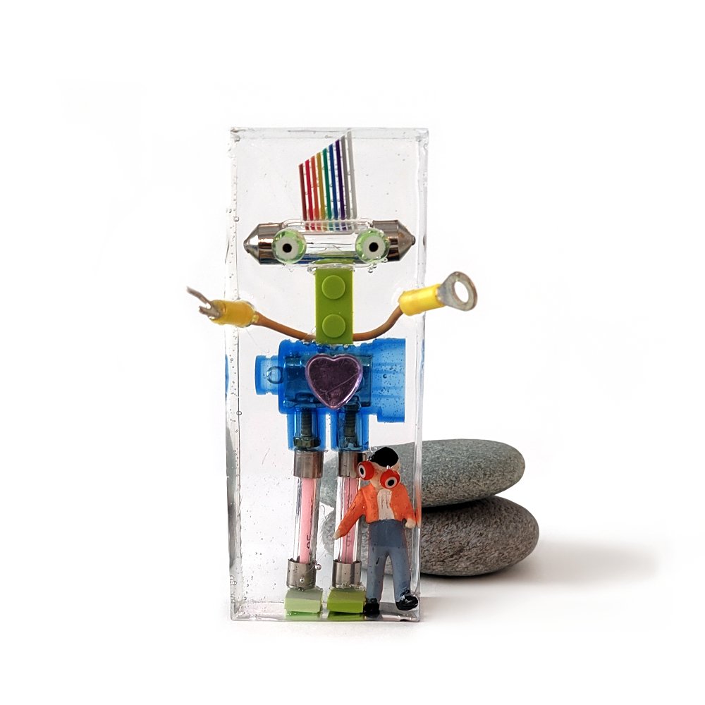 This fun whimsical robot sculpture is made with obsolete tech, then set into resin. It’s called a cryobot, a little robot frozen in time.