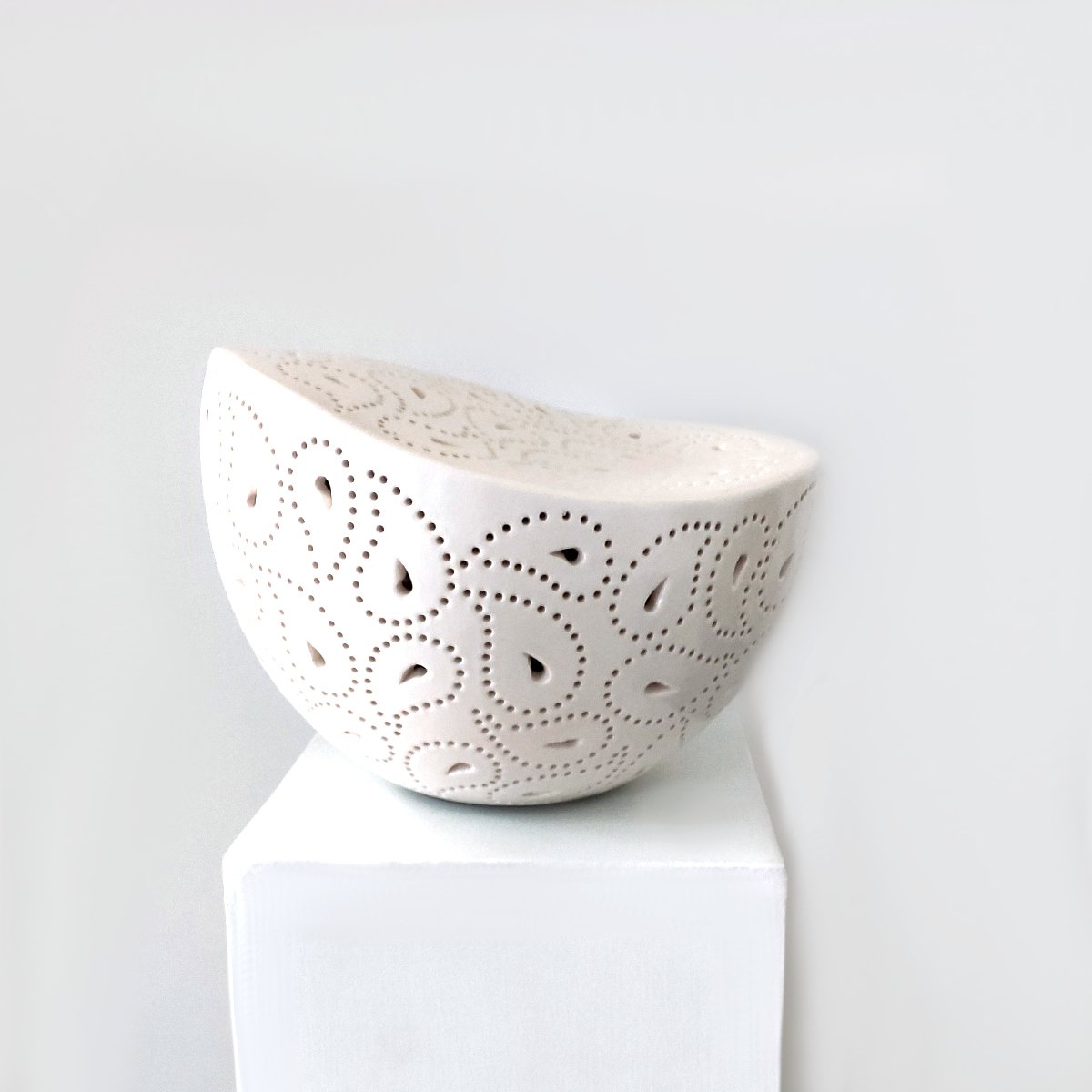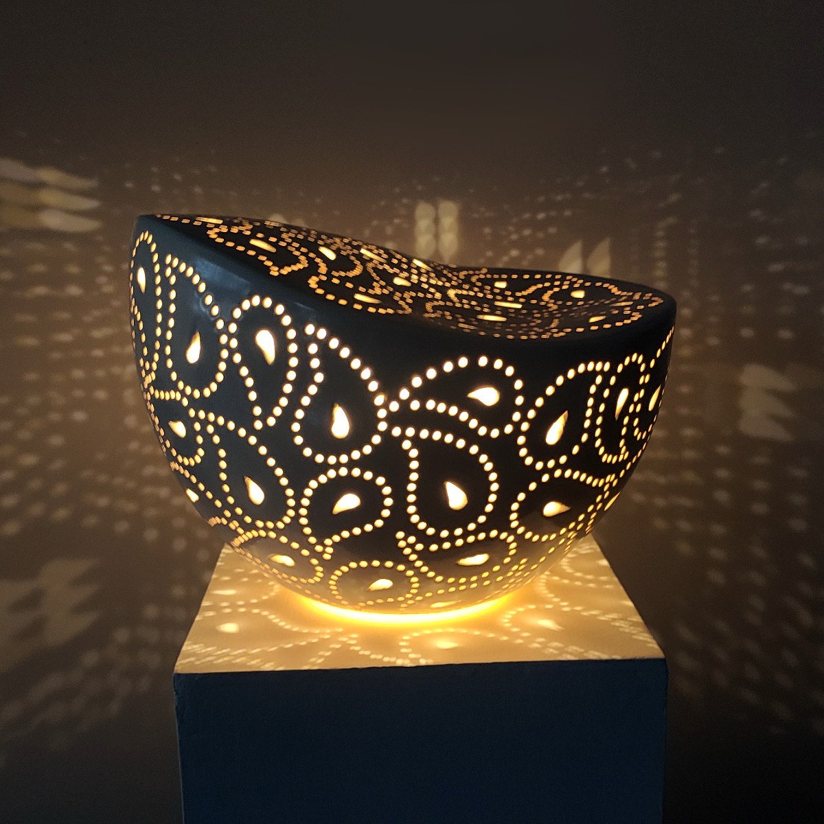 Handcrafted in New Zealand by artist Ronald Andressend, this ceramic lamp is a true statement piece. Its paisley pattern is achieved through the meticulous process of hand-carving into the raw clay, followed by applying a white glaze and then firing. The result is a beautiful light source that delivers outstanding warmth and atmosphere, creating dynamic, ambient patterns of light and shadow throughout the room.