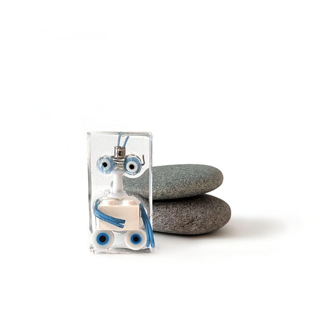 Introducing No10 Plexi by Amanda Watson. This fun mini robot sculpture is made with obsolete tech, then set into resin. It’s called a cryobot, a little robot frozen in time.