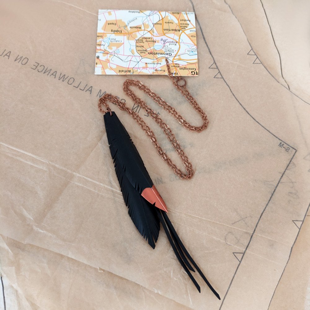 Black "feather" necklace with a copper tip, lovingly hand-made from “up-bicycled” tyre inner tubes. The discarded inner tube is cleaned, polished and attached to a long brass ball chain, resulting in this beautiful and light weight feather necklace. This really is one of a kind jewellery design for a better world.