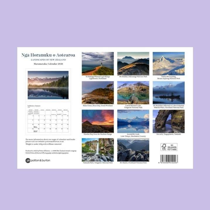 Ngā Horanuku o Aotearoa is a bilingual calendar of te reo Māori and English, featuring stunning New Zealand landscapes of cultural significance.
