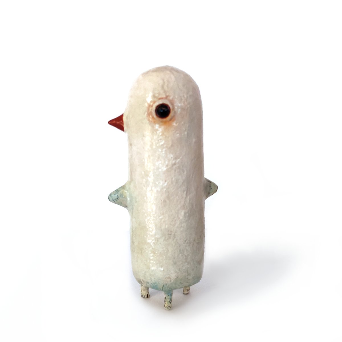 This fun paper mache sculpture is a Bird Totem. They are exceptionally charming but can be mischievous. They usually hide at the edge of the night forest waiting for the first light of the day to reach the trees. If you decide to befriend this lovely Bird Totem and invite it into your home, it will love a place on your bookshelf, desk or bedroom side table.