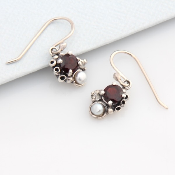 With an earthy elegance, these divine little earrings are both modern and distinctive. Round 5mm garnets sparkle from their setting, along with freshwater pearls and twinkling set moissanites. The surface that surrounds the stones echos the unique and mysterious textures of the rock pool. These treasures are the perfect addition to any outfit.