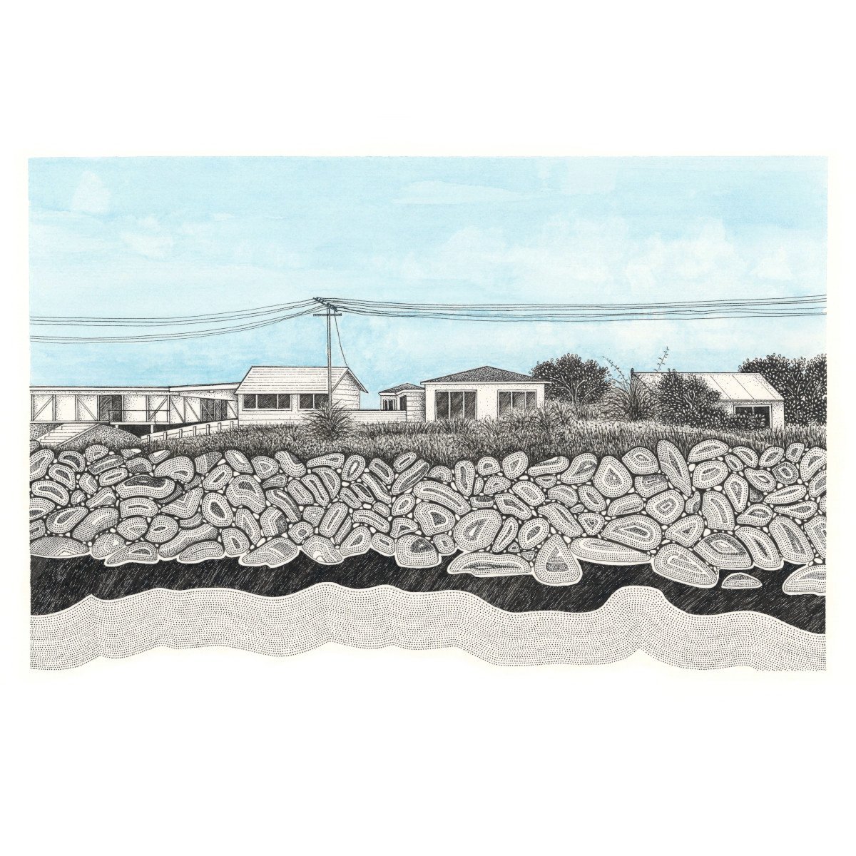 This is a limited edition fine art print created from an original piece by New Zealand artist Penelope Reid. It captures the unique charm and character of the beach houses on Parade Road, Paekākāriki Beach, offering a stunning piece of coastal New Zealand for your collection.
