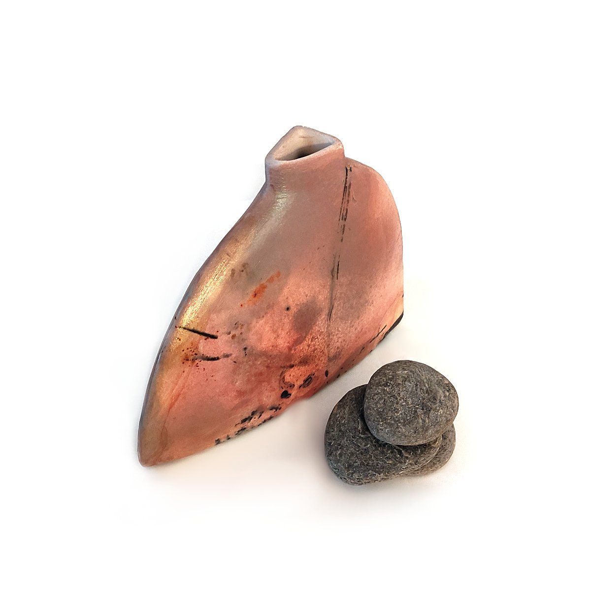 This stunning ceramic vase by local artist Chris Dunn is a masterclass in elemental design. Handcrafted using the ancient method of pit firing, the oldest known technique for hardening clay. Each piece is nestled in an open pit with organic materials that ignite and "paint" the surface. The resulting smoky shadows and earthy marbling are a direct record of the fire's movement, making every vase entirely one of a kind.