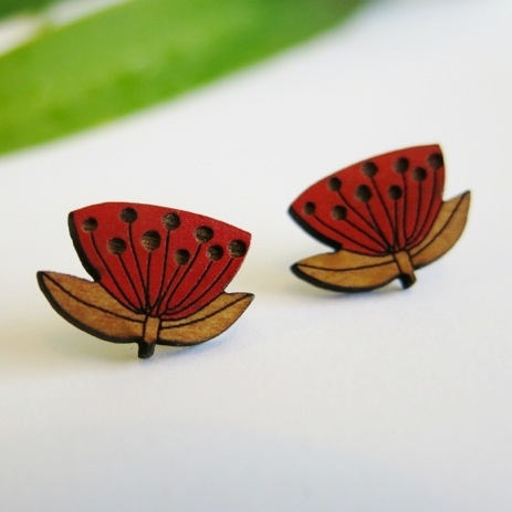 From the lovely people at "I Feel Natty" in Wellington these laser cut and hand painted pohutukawa flower earrings are made from reclaimed rimu wood. Posts are surgical steel - good for sensitive ears. While the earrings are sealed and coated they are not designed to be worn swimming or in the shower. Made in NZ.