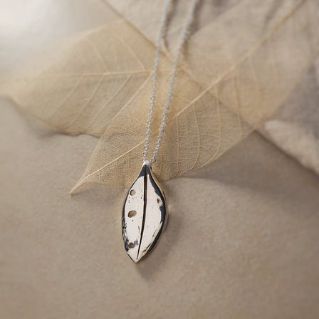 Detailed Pōhutukawa leaf necklace, skillfully cast in silver from a handmade original, finished with a sterling silver chain and clasp.