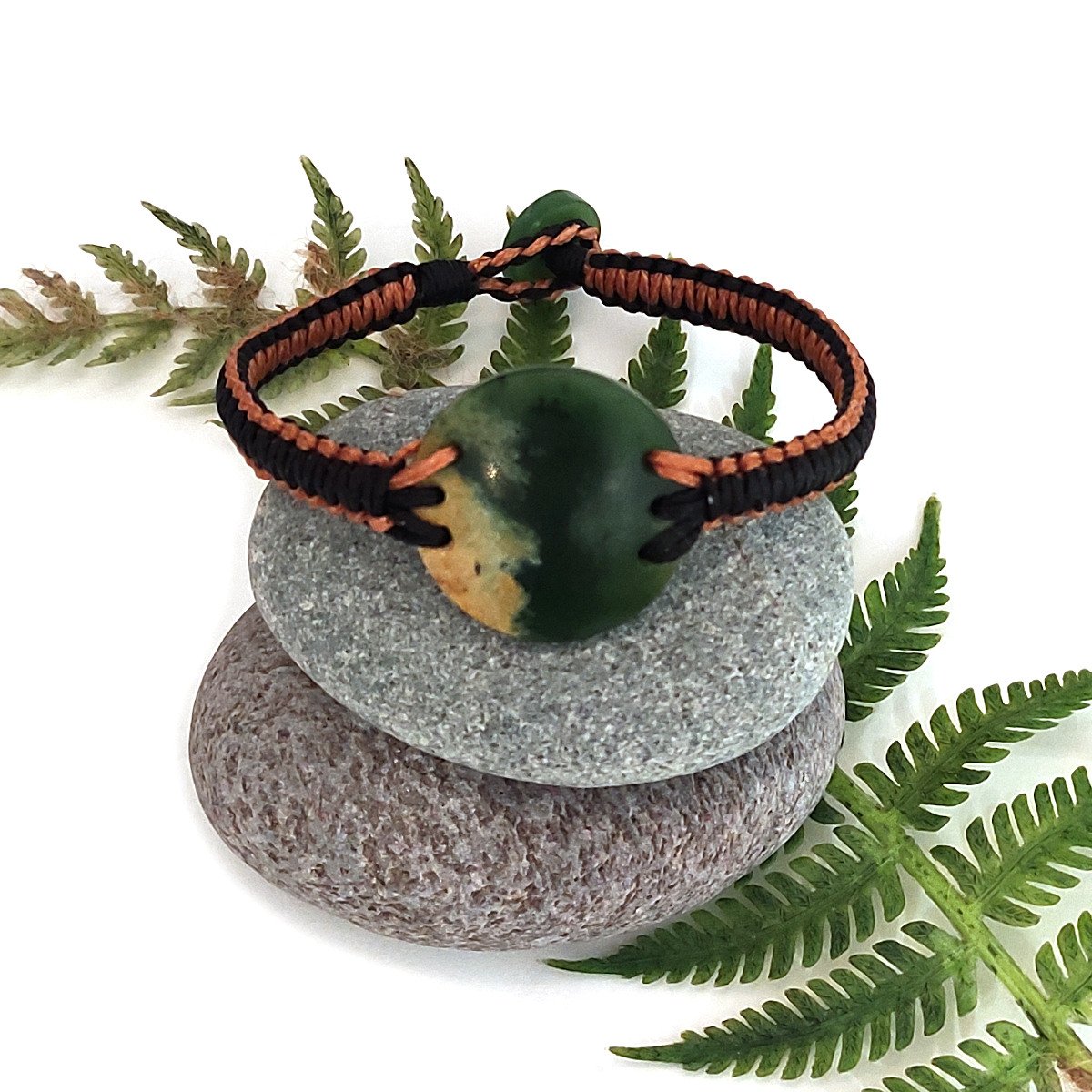 Hand carved New Zealand Pounamu (NZ greenstone) bracelet by Darren Hill, featuring a round piece of pounamu, lashed with a waxed cord and a greenstone button and loop clasp.