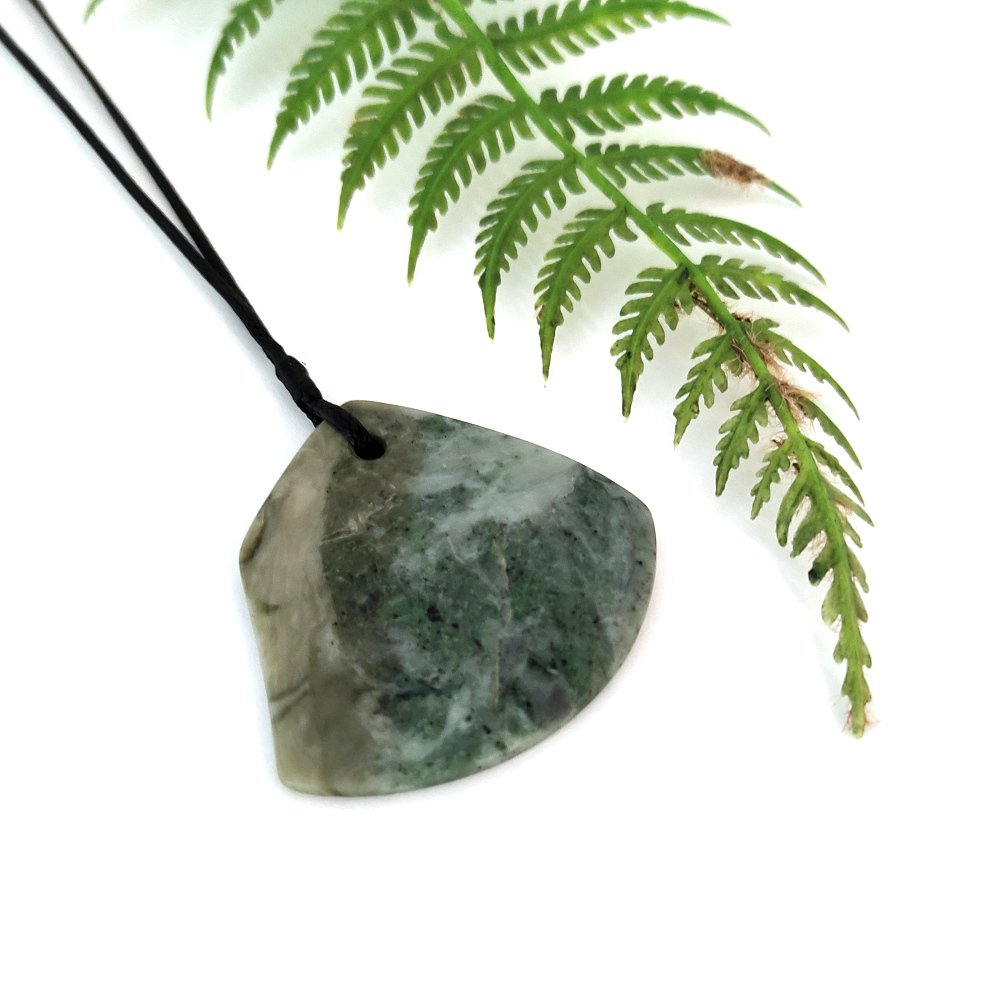 Hand-carved pounamu pendant on a tightly braided cord with sliding knots for adjusting.