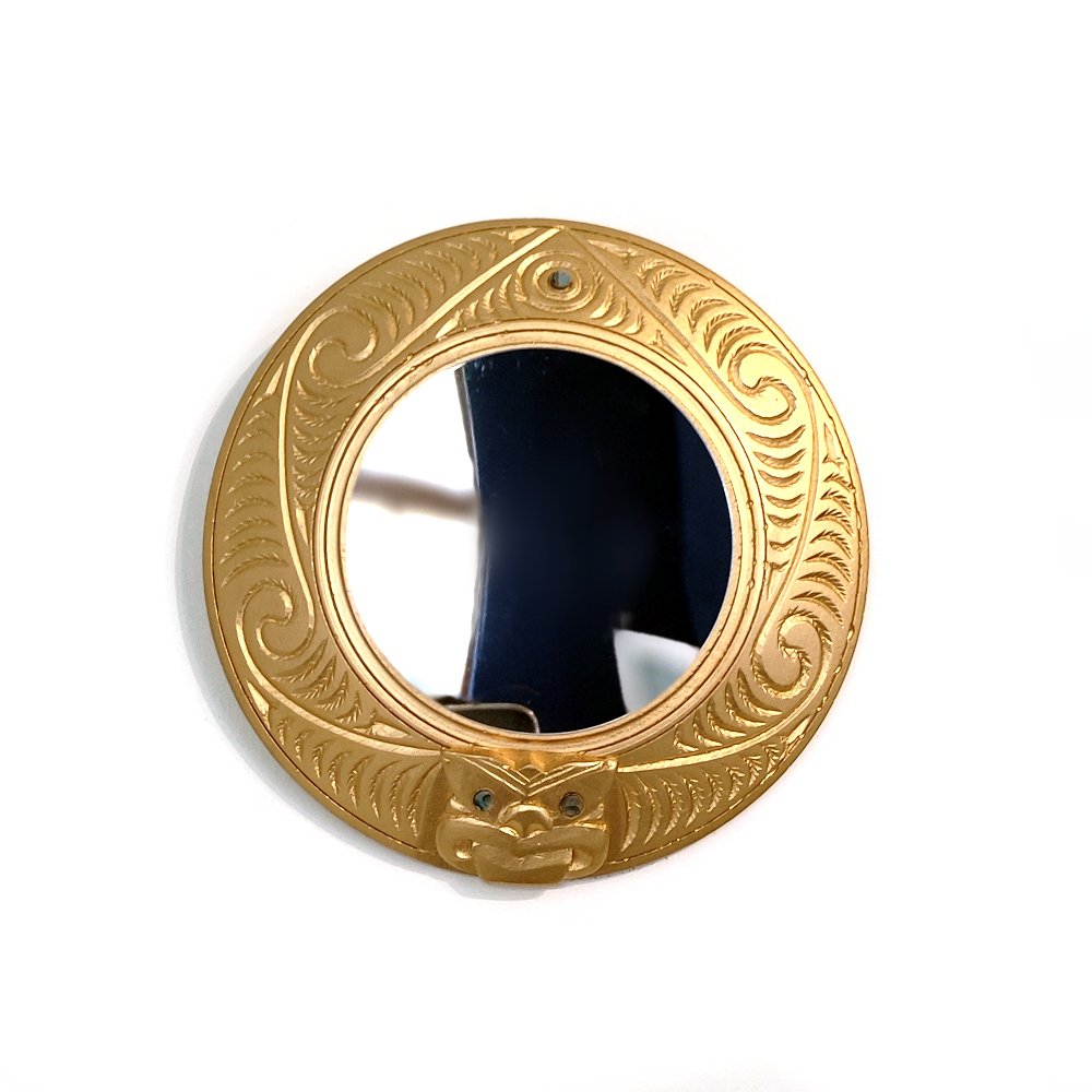 This Puna mirror was crafted by Messini Palace, using a single handmade mold. It has a Wheku (carved face) which represents an important ancestor (tupuna) or a guardian (kaitiaki) and is traditionally found at the apex of the gable at the front of a meeting house watching over everyone. It has a Pukana, (protruding tongue), an expression that communicates deep felt emotion in waiata and kapa haka.