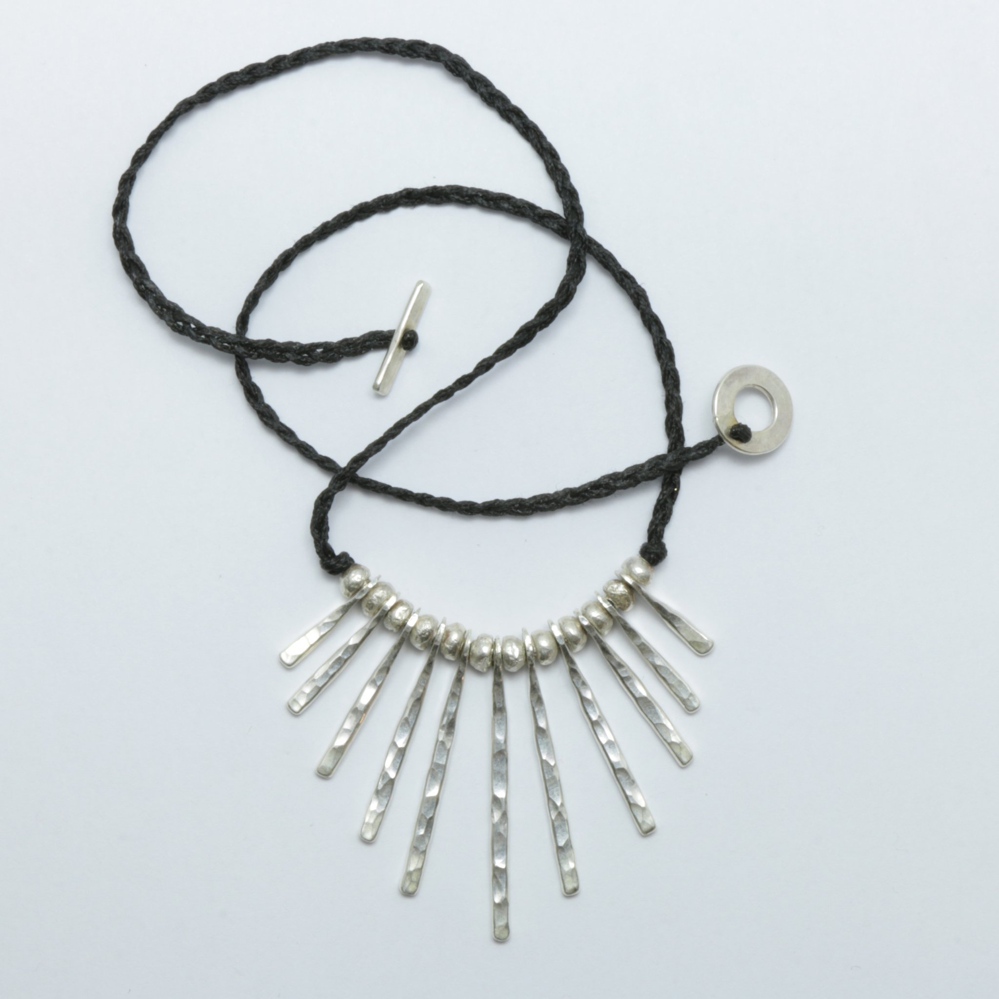 Rā (starburst) Necklace. Radiant hand peened rods of silver refracting light feel glamorous and nicely weighted. Hand forged pure silver rods spaced with organically hand made sterling silver beads.
