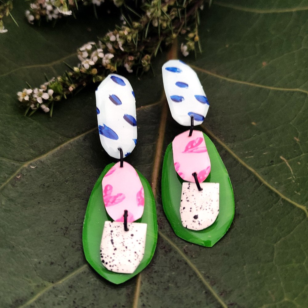 Pip Day's playful earrings feature hand-painted Japanese paper, cut into unique shapes and encased in resin for a vibrant, one of a kind look. Each earring has a post and butterfly backing.