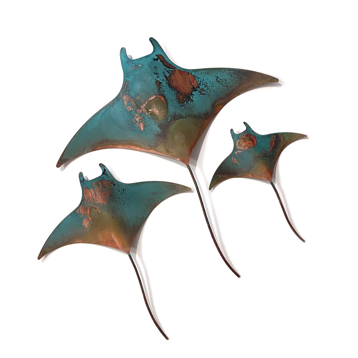 Crafted by Daniel Wright from recycled copper, this set of three manta ray is designed to bring a touch of the ocean to your walls. Each Stingray boasts its own unique patina finish, ensuring a one of a kind display.