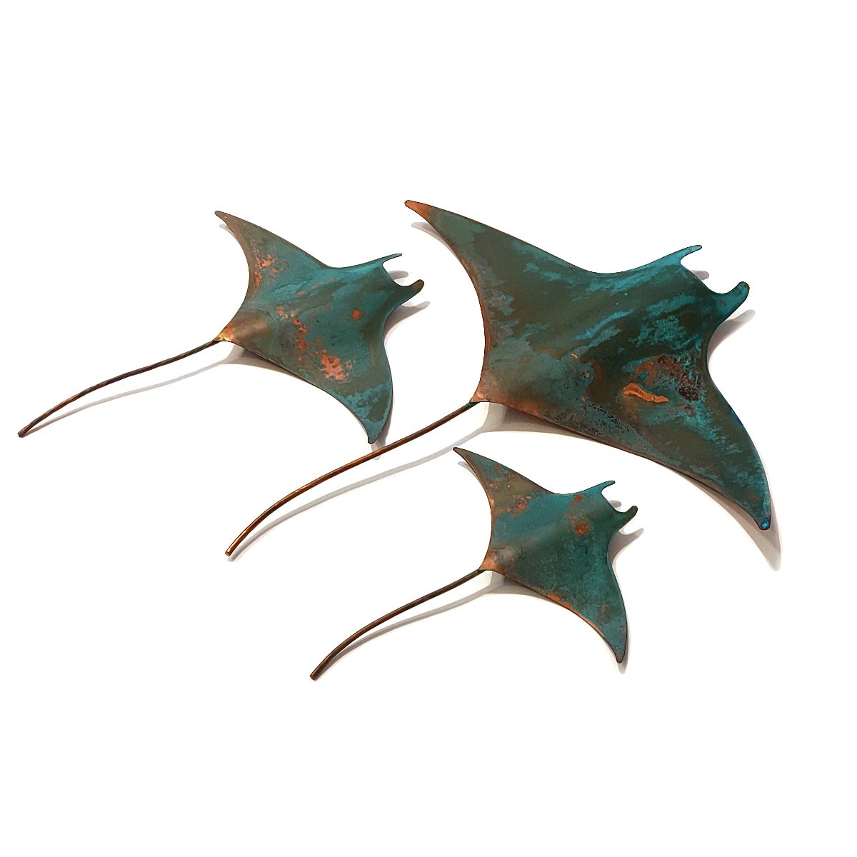 Crafted by Daniel Wright from recycled copper, this set of three manta ray is designed to bring a touch of the ocean to your walls. Each Stingray boasts its own unique patina finish, ensuring a one of a kind display.