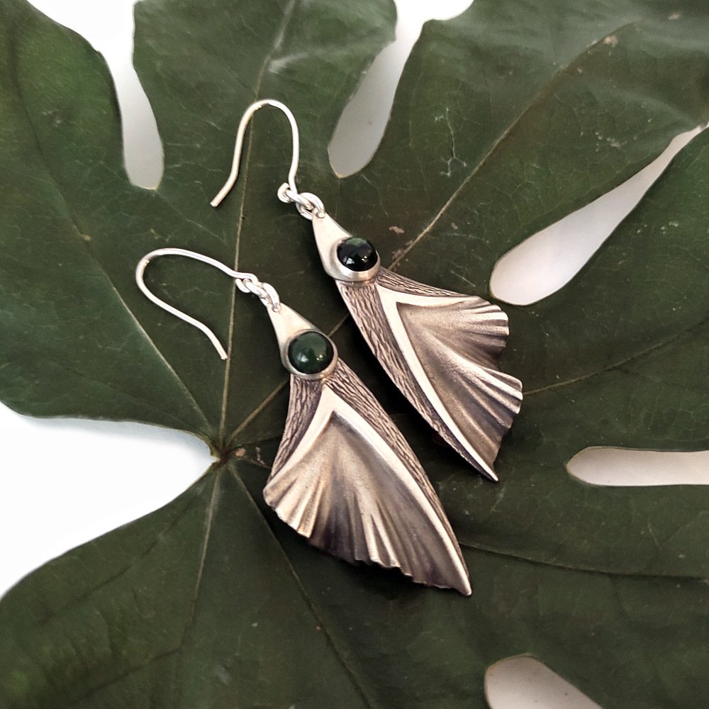 This stunning pair of earrings has been created by Maddy at Kawakawa Stone, inspired by the native fauna and flora of Aotearoa New Zealand. It is cast in solid sterling silver, with a New Zealand Green pounamu cabochon insert.