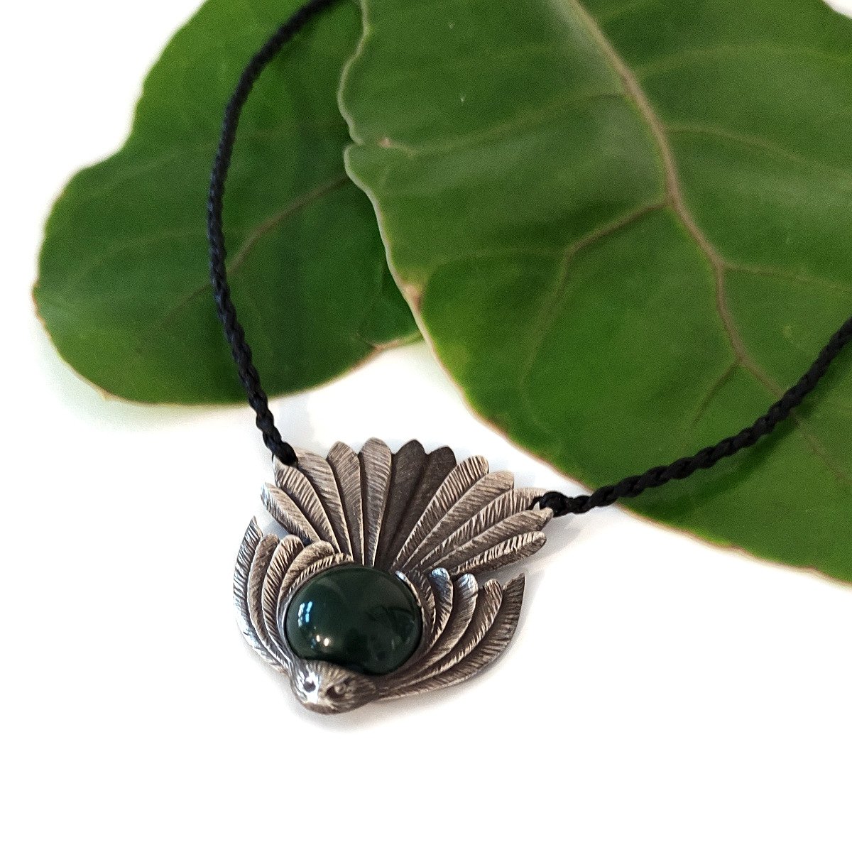 This handcrafted sterling silver pendant exquisitely captures the Piwakawaka (Fantail) in its iconic, graceful flight, a timeless symbol of freedom and dynamic motion. Meticulously carved by Maddy from Kawakawa Stone, every detail reflects the bird's delicate wings mid-flutter, freezing a moment of lively movement. Completing the design is a vibrant, hand-carved jade cabochon, which provides a natural, grounding beauty to this unique wearable artwork.