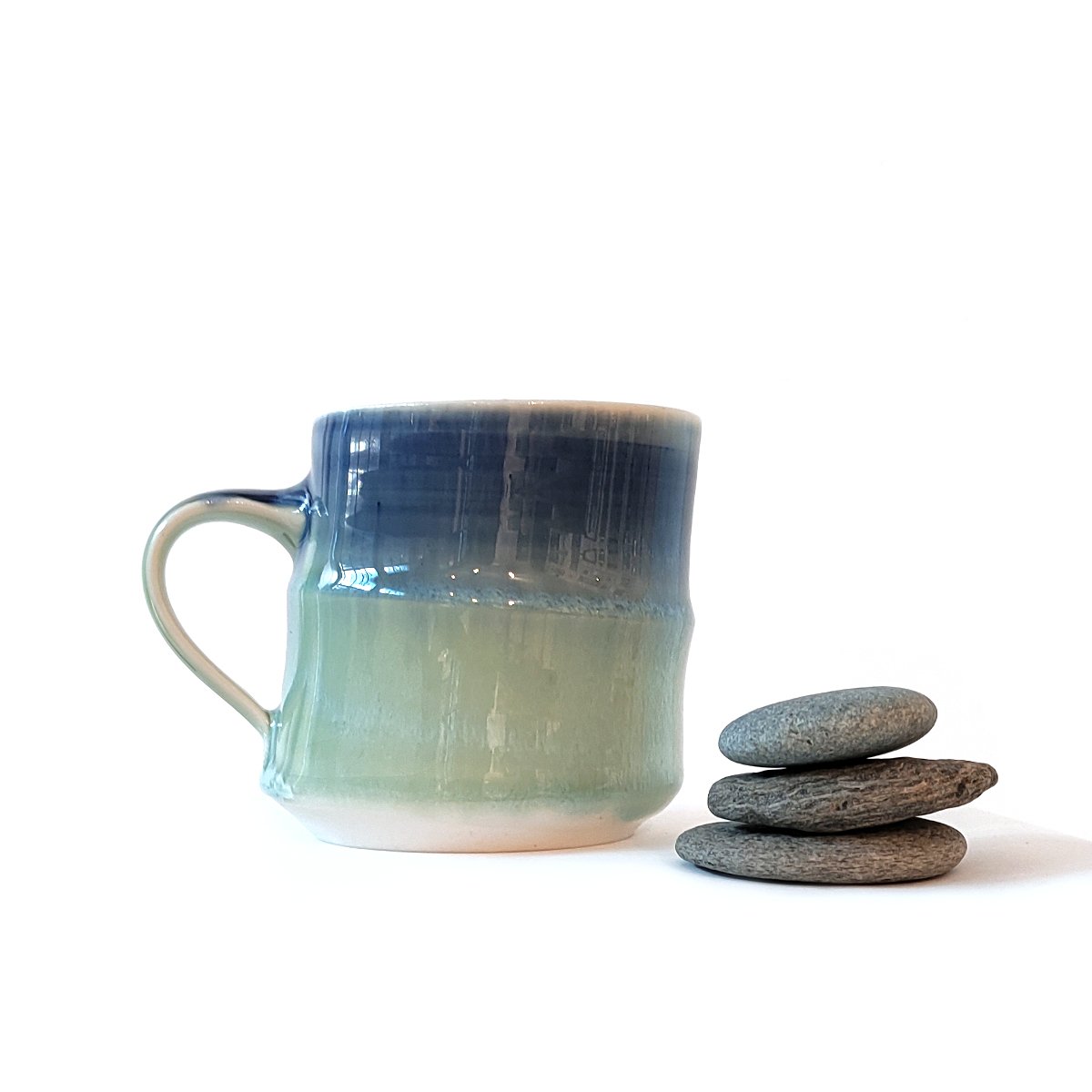 Enjoy your favorite beverage in this Porcelain Cup, handcrafted by local artist Michael Robinson. Its finely thrown form features subtle dips and curves, lending a unique, tactile quality to this piece. Finished with a beautiful 'seafoam and blue' glaze, one of the many distinctive glazes Michael lovingly creates.