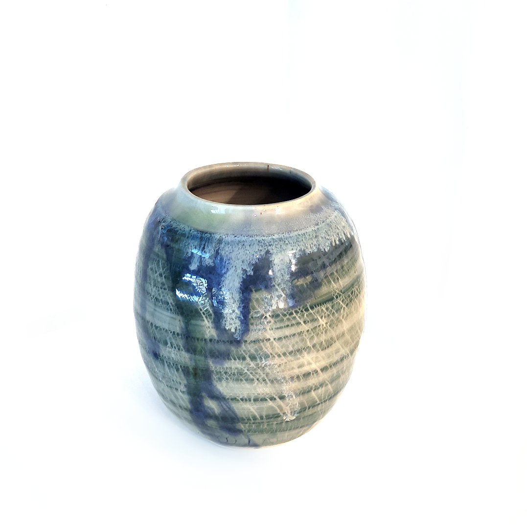 This handcrafted ceramic vase is by Kapiti Coast artist Sarah Bromley. Fired in an electric kiln to perfectly preserve its vivid palette, the piece features lovely green and blue glazes that flow in elegant drips down its edges. A beautiful blend of local artistry and organic movement.