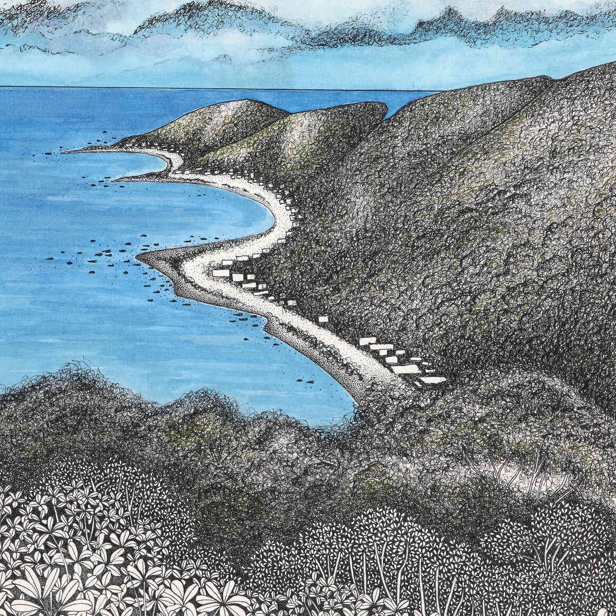 This limited edition art print is reproduced from an original ink and watercolour painting by Penelope Reid. Set high in the hills overlooking the South Coast of Wellington, the work captures a panoramic vista across Eve Bay, Flax Bay, and Reef Bay.