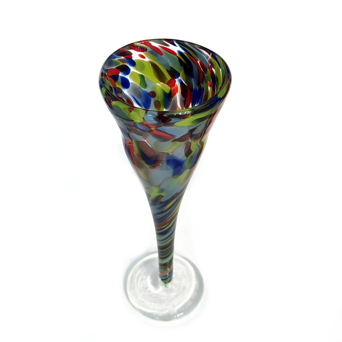Elevate your collection with this exquisite hand-blown glass Goblet, a unique creation by renowned New Zealand glass artist Anthony Genet of Flamedaisy. The piece is brought to life by a vibrant, colourful overlapping spotty pattern, showcasing the artist's masterful technique and playful use of light and colour.