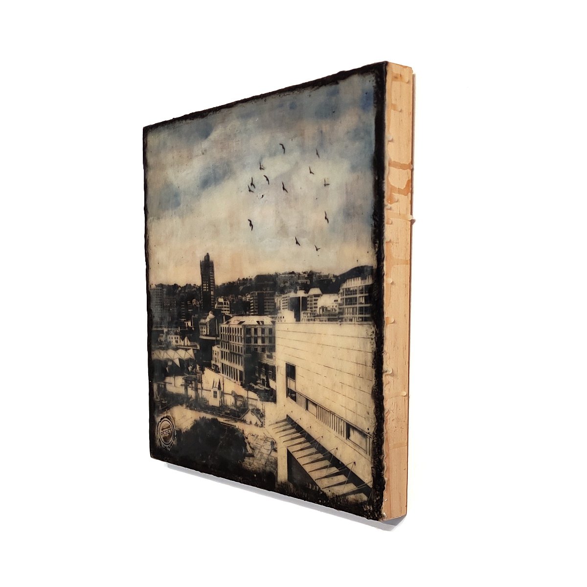 Local artist Kim Kobialko of Studio Reset captures the sweeping energy of Wellington’s waterfront in this encaustic work featuring the iconic Te Papa Museum. By layering molten beeswax and resin over a black and white photograph, Kim adds a luminous, tactile depth that transforms the harbor scene into a rich, multidimensional piece of art. The result is a striking contrast between the grand, modern architecture of the museum and the organic, hand-fused texture of the wax.