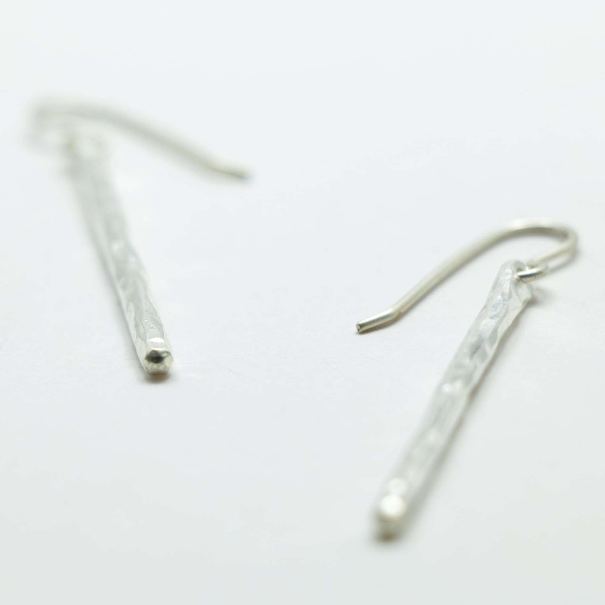 These earrings are a classic drop. The peened hammer effect on the surface they twinkle away like dew drops in the morning sun.