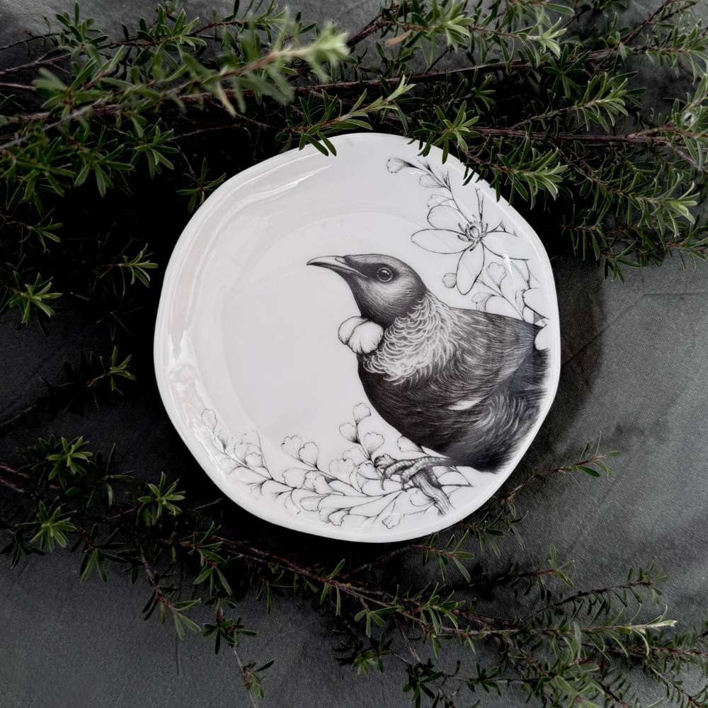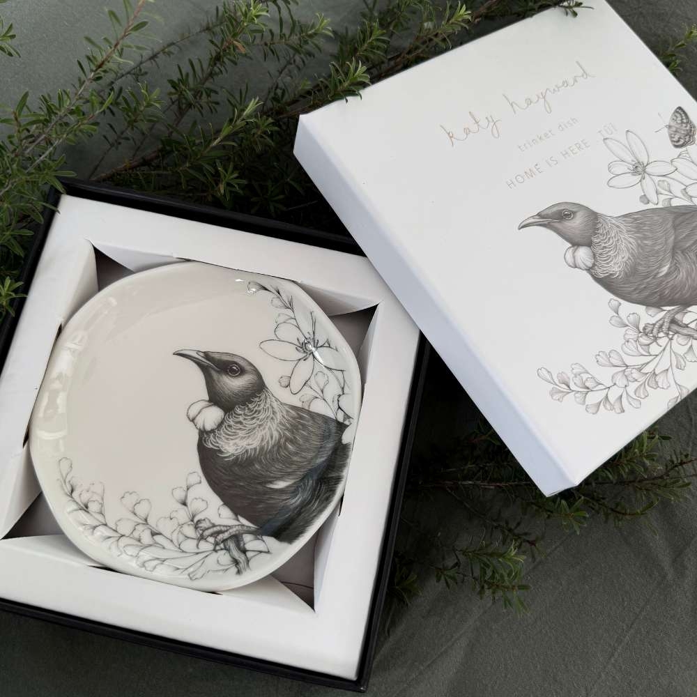 ‘Home is here’, featuring a tūī bird perched on a wave of Aotearoa | New Zealand native flora, including- puawananga | clematis, kawakawa, mānuka and kōwhai.