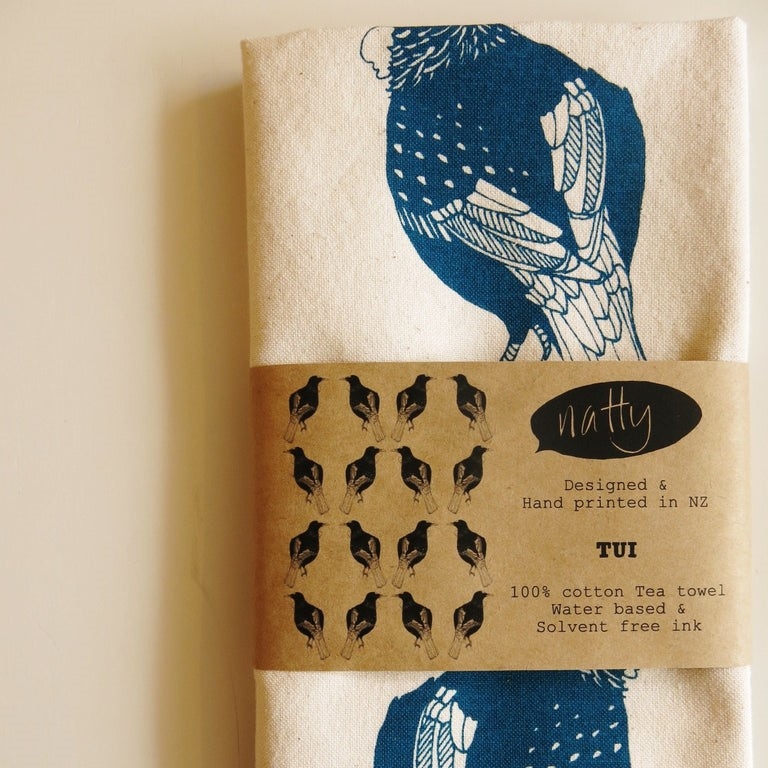 100 % natural (unbleached) ethically sourced cotton tea towel hand screen printed with Natty's hand drawn Tui design. Comes in a lovely teal colour.